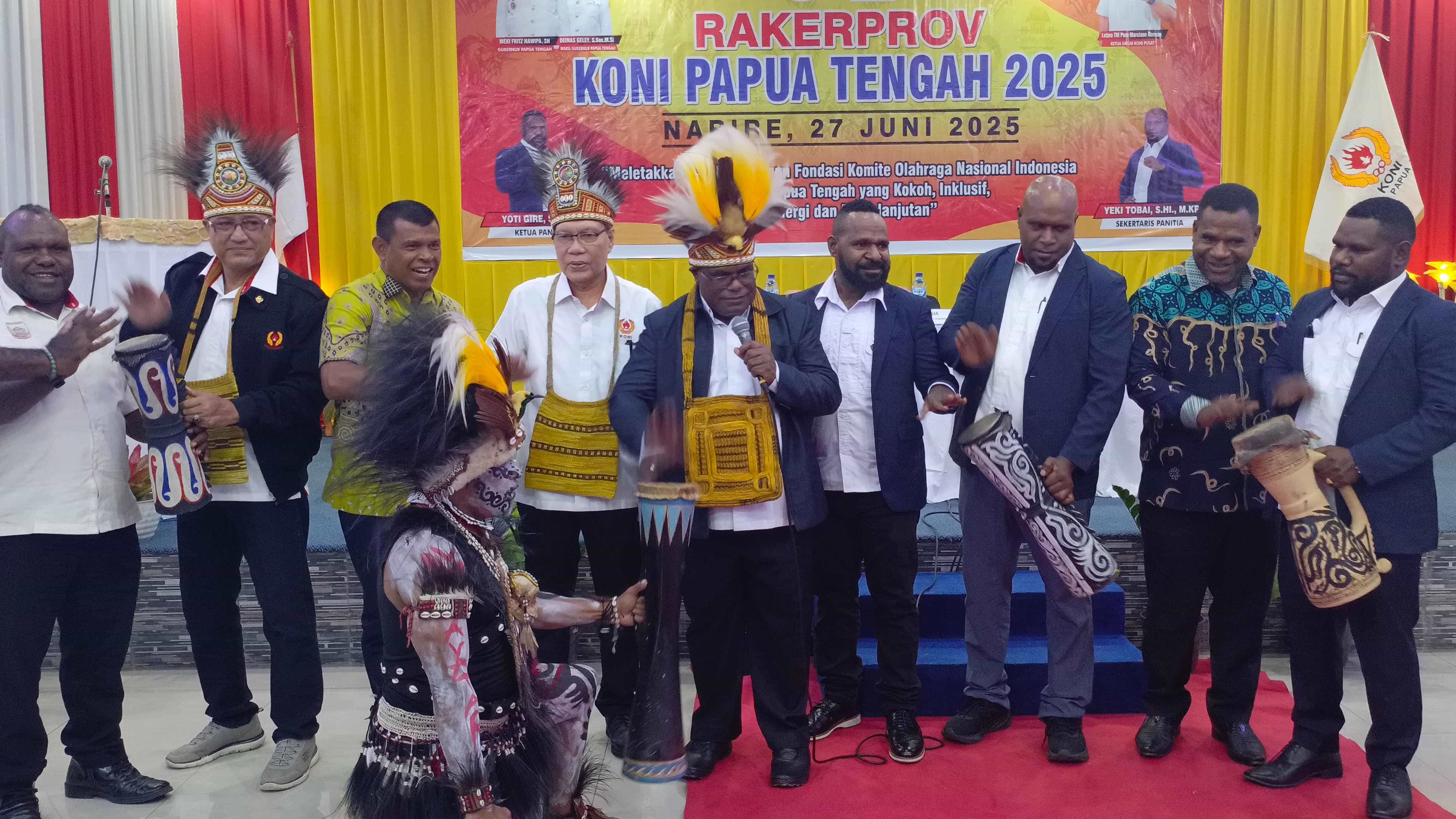 PAPUATENGAH.INFO –Gubernur Papua Tengah Meki Fritz Nawipa, didampingi Pengurus KONI Pusat, Pengurus KONI Provinsi serta Panitia membuka Rapat Kerja Provinsi (Rakerprov) dan Musyawarah Olahraga Provinsi (Musorprov) KONI Provinsi Papua Tengah, Jum’at (27/6) di Auditorium RRI Nabire dengan pemukulan Tifa.